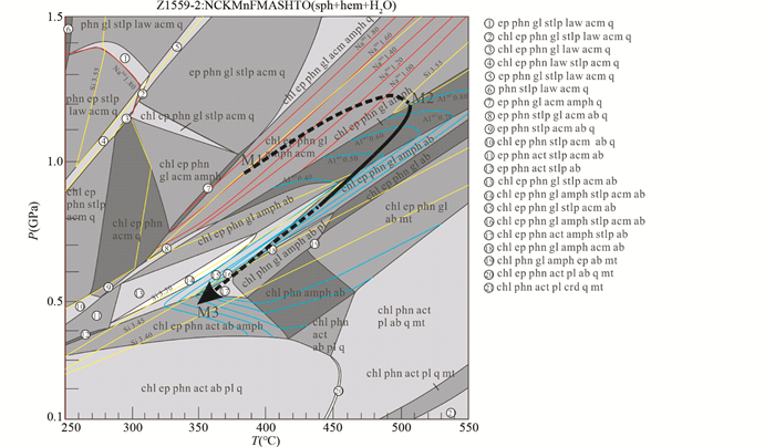 图 7为样品Z1559-2在NCKMnFMASHTO体系下P-T视剖面图。根据角闪石产出特点和环带成分特征,识别出三个阶段的矿物组合。早期阶段(M1),实测的多硅白云母和蓝闪石中NaM4等值线限定矿物组合chl+ep+phn+gl+amph+acm稳定的温压范围在370℃、0.94GPa以上。峰期阶段(M2)矿物组合为chl+ep+phn+gl+amph+sph,从视剖面图可以看出,多硅白云母中Si含量和角闪石中AlM2的含量的等值线在该组合范围内呈正斜率,并且Si含量主要受控于压力,随压力的增加而增大;AlM2的含量主要受控于温度,随温度的增加而增大。因此,根据实测的矿物成分,采用多硅白云母中Si含量和角闪石中AlM2的含量限定该阶段矿物组合的温压范围在450~500℃、0.95~1.2GPa,并且是一个明显的降温降压过程。晚期阶段(M3)以钠长石斑晶和基质矿物为主,矿物组合为chl+ep+phn+amph+act+ab+sph,稳定的温压范围为<420℃和<0.52GPa。根据多硅白云母中Si含量和角闪石中AlM2的含量的交点,限定该阶段矿物组合的温压范围为330~375℃、0.45~0.52GPa。