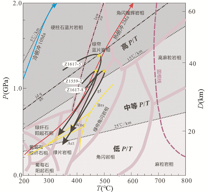本文通过对依兰地区不同类型蓝片岩的研究,更精确的限定了石榴石冻蓝闪石片岩(500~525℃、1.14~1.2GPa)、绿泥绿帘蓝闪石片岩(480℃、1.4GPa)、白云母蓝闪石片岩(450~500℃、0.95~1.2GPa)峰期变质作用的温压条件,其峰期变质级别都达到了绿帘-蓝片岩相(图 8),该温压条件略高于前人研究的结果。由于未发现榴辉岩相矿物组合,我们认为本区蓝片岩相岩石为俯冲深度较浅的变质作用产物。Evan(1990)计算出,矿物组合中Fe2+/Mg值的增加,使变质作用更容易达到绿帘-蓝片岩相的范围。从本区蓝片岩P-T演化轨迹可以看出,退变质过程中,明显的减压作用导致了蓝片岩相和绿片岩相的叠加作用。蓝片岩相向绿片岩相的转化在富Fe3+和Fe2+的岩石中容易发生,此时富Mg和Al的矿物不稳定。矿物组合ab+ep+act/brs是绿帘-蓝片岩相转化成绿片岩相的标志(Evan, 1990)。岩石中没有观察到绿纤石等代表更低级变质程度的矿物出现,这与相平衡模拟计算的温压条件相符。
