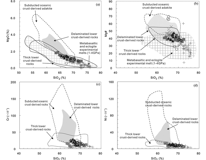 义敦岛弧形成于晚三叠世甘孜-理塘古特提斯洋盆的西向俯冲,随后发生弧-陆碰撞,侏罗纪时期,义敦岛弧与松潘-甘孜地块板内岩浆的发育,表明该时期区内已经进入陆内环境(张能德和张怀举, 1993; 曲晓明等, 2003; 胡健民等, 2005; 赵永久等, 2007; Liu et al., 2007; 王全伟等, 2008; Wang et al., 2014a, b; Wu et al., 2014),且Wang et al. (2014a)研究表明,中甸弧晚白垩世弧岩浆岩具有比区域上拉萨地体等同期的弧岩浆岩更低的εHf(t)的值,说明中甸弧晚白垩世时期的热林和铜厂沟等岩体不可能形成于俯冲大洋板片的部分熔融。我们野外工作期间,在热林二长花岗岩体和铜厂沟花岗闪长斑岩体中并没有发现壳源捕掳体,而且截止目前中甸弧地区也没有晚白垩世玄武质岩浆作用的报道;同时Yang et al. (2017)研究表明铜厂沟花岗闪长斑岩具有较低的(87Sr/86Sr)i比值及均一的εNd(t),因此研究区晚白垩世岩体也并非是幔源玄武质岩浆的AFC演化的结果。同源于拆沉下地壳部分熔融形成的埃达克质岩相比,热林和铜厂沟岩浆岩具有低的MgO(0.86%~1.49%)、Mg#值(36.3~47.3)以及Cr(10.5×10-6~28.6×10-6)、Ni(6.80×10-6~12.5×10-6)含量,表明其并非是源于拆沉下地壳,而很可能为加厚下地壳部分熔融的产物(图 8)。研究区样品微量元素REE配分图中显示出亏损HREEs和Y,指示热林和铜厂沟岩体起源于含有石榴石的物质源区,源区深度>30km(Rapp and Watson, 1995)。上述推论与研究区前人的研究结果相一致(Wang et al., 2014a, b; Yang et al., 2016, 2017; Gao et al., 2017; 余海军等, 2015; 余海军和李文昌, 2016)。