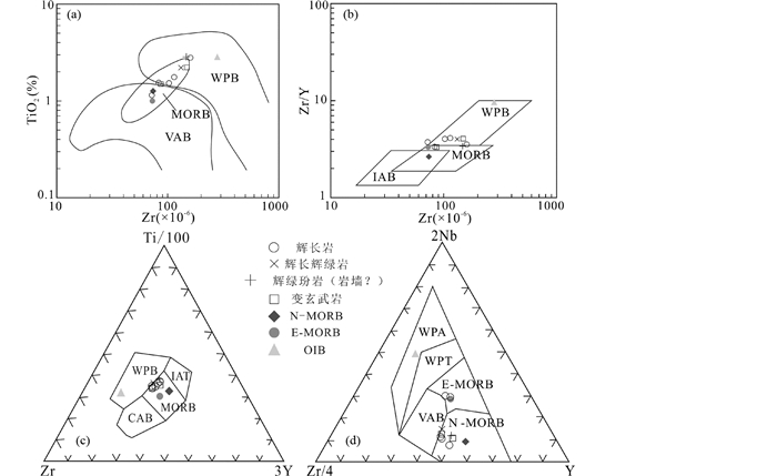 图 10 乌奴耳-头道桥蛇绿混杂岩的TiO2-Zr图解(a, 据Pearce, 1982)、Zr/Y-Zr图解(b, 据Pearce and Norry, 1979)、Ti/100-Zr-3Y图解(c, 据Pearce and Cann, 1973)和2Nb-Zr/4-Y图解(d, 据Meschede, 1986) Fig. 10 Diagrams of TiO2 vs. Zr (a, after Pearce, 1982), Zr/Y vs. Zr (b, after Pearce and Norry, 1979), Ti/100-Zr-3Y (c, after Pearce and Cann, 1973), 2Nb-Zr/4-Y (d, after Meschede, 1986) for the Wunuer-Toudaoqiao ophiolitic mélange |
