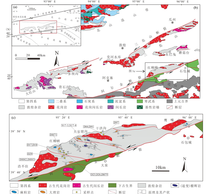 1 地质背景敦煌造山带位于北山造山带南侧,南以阿尔金断裂为界与祁连造山带相邻,西北侧以且末-星星峡断裂为界与塔里木克拉通相接,东临阿拉善地块(图 1a)。新生代ENE-WSW走向的区域性断裂将敦煌造山带分割为一系列块体单元,包括北部的三危山块体、中部的东巴兔-蘑菇台块体和南部的红柳峡块体(混杂带),以及西南部的多坝沟-大红山块体和青石沟块体,造山带大部分被戈壁覆盖(图 1b)。岩石组合方面,出露于敦煌造山带的主要是一套中-高级变质表壳岩和TTG片麻岩(甘肃省地质局, 1989),见少量中生代基性岩墙侵入(冯志硕等, 2010)。变质表壳岩被称为“敦煌杂岩”,包括变质砂岩、变泥质岩、大理岩和少量混合岩等(甘肃省地质局, 1989),其中裹杂着不同变质程度和变质年代的变质基性岩岩块,如斜长角闪岩、基性(高压)麻粒岩和榴辉岩等(Zong et al., 2012; Zhang et al., 2012, 2013; 王忠梅等, 2013; Wang et al., 2014, 2016, 2017a, b; He et al., 2014; 彭涛等, 2014; Zhao et al., 2016)。TTG片麻岩包括太古宙TTG片麻岩(梅华林等, 1998; 赵燕等, 2013, 2015a; Zong et al., 2013; Zhang et al., 2013; Zhao et al., 2015)和出露于党河水库一带的古生代TTG片麻岩(张志诚等, 2009)。另外,敦煌造山带内还广泛发育志留纪、泥盆纪和晚石炭世花岗质侵入岩(朱涛等, 2014; Wang et al., 2014; 赵燕等, 2015b; Zhao et al., 2016, 2017; 王楠等, 2016a, b; Bao et al., 2017)。