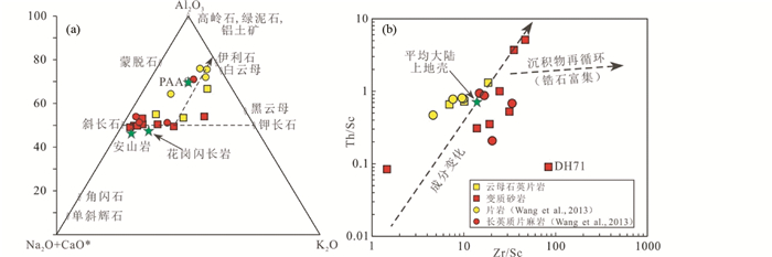 大离子亲石元素(Rb、Sr、Ba等)活动性较强,Rb主要赋存于钾长石,Sr主要赋存于斜长石。片岩样品中Rb、Sr含量接近PAAS,Ba含量变化略大(图 6b)。变质砂岩相对于PAAS亏损Rb、富集Sr,这与变质砂岩富斜长石、贫钾长石的岩相学特征相对应,Ba含量接近PAAS(图 6d)。高场强元素(Zr、Hf、Nb、Ta等)活动性较弱且为不相容元素,主要赋存于长英质岩石中的副矿物,它们的富集通常反映沉积物的再循环程度高。样品中HFSE的含量大多低于PAAS中的含量(图 6b, d),表明基质的碎屑物再循环程度低。过渡族元素(Sc、Cr、Co、Ni等)主要赋存于镁铁质矿物,倾向于进入基性-超基性岩石中。片岩样品中Co、Ni、Sc、Cr含量接近PAAS的含量,但变质砂岩中的含量低于PAAS的含量(图 6b, d),可能反映片岩的物源相对于变质砂岩的物源有更多镁铁质碎屑物质的加入。