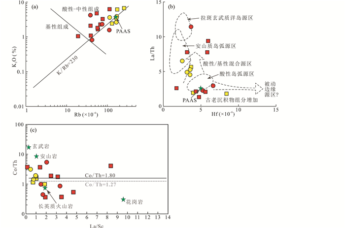 碎屑岩中K和Rb的含量及Rb/K比值,可指示母岩成分,Rb和K含量高,暗示母岩中-酸性组分含量高。在Rb-K2O投图中(据Floyd and Leveridge, 1987),样品分布在中-酸性组分区,个别落入基性组分区(图 11a),表明母岩主要为中-酸性岩石。来自酸性岛弧源区的沉积物La/Th变化范围小,Hf含量3×10-6~7×10-6,随着中-基性岛弧源区沉积物的加入,La/Th值升高,Hf含量有所降低,而古老沉积物的加入则导致Hf含量升高,碎屑沉积岩的Hf-La/Th投图可以较好地区分不同物质组成的源区(Floyd and Leveridge, 1987)。样品主要分布在酸性岛弧源区以及酸性向安山质岛弧源区过渡的区域(图 11b),表明基质物源区母岩主要为中-酸性岩石。在La/Sc-Co/Th投图中(据Gu et al., 2002),样品主要分布于长英质火山岩和安山岩成分附近(图 11c),暗示母岩主要为长英质岩石和安山岩。