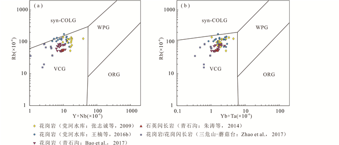 图 12 敦煌造山带内古生代花岗质-花岗闪长质侵入体构造背景的地球化学判别图解(底图据Pearce, 1984) syn-COLG:同碰撞花岗岩;WPG:板内花岗岩;ORG:洋中脊花岗岩;VCG:弧花岗岩 Fig. 12 Geochemical diagrams of tectonic setting for the Paleozoic granitoid in the Dunhuang Orogenic Belt (after Pearce, 1984) syn-COLG: syn-collisional granite; WPG: within plate granite; ORG: oceanic ridge granite; VCG: volcanic arc granite |