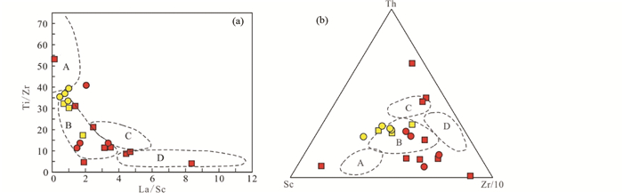 3.2 大地构造背景碎屑岩中不活动微量元素组成(如REE、Th、Sc、Zr),是判别其形成构造背景较为可靠的地球化学指标(Bhatia and Crook, 1986; McLennan et al., 1993)。在La/Sc-Ti/Zr和Th-Sc-Zr/10投图中(据Bhatia and Crook, 1986),样品主要落入陆缘弧和活动大陆边缘区域(图 13),说明基质形成于与陆缘弧或活动大陆边缘有关的构造背景。