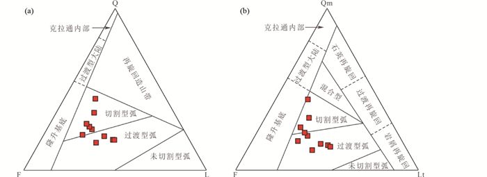 砂岩碎屑组分与物源区及其构造背景关系密切,常用于判别砂岩物源区类型及其沉积盆地的构造背景(Dickinson and Suczek, 1979; Dickinson and Valloni, 1980; Dickinson, 1985)。基质中弱变形浅变质砂岩的碎屑模式Q-F-L和Qm-F-Lt投图中(图 14),样品落入“切割型弧”及“过渡型弧”源区。Dickinson (1985)指出,“切割型弧”源区碎屑,来源于深切割的岩浆弧根部侵入体,具有较高的P/K比值和岩屑含量。样品的P/K比值较高(16~130,其余2个样品为3和5),岩屑总量(Lt)较高(18%~45%),与“切割型弧-过渡型弧”源区来源的碎屑特征吻合。