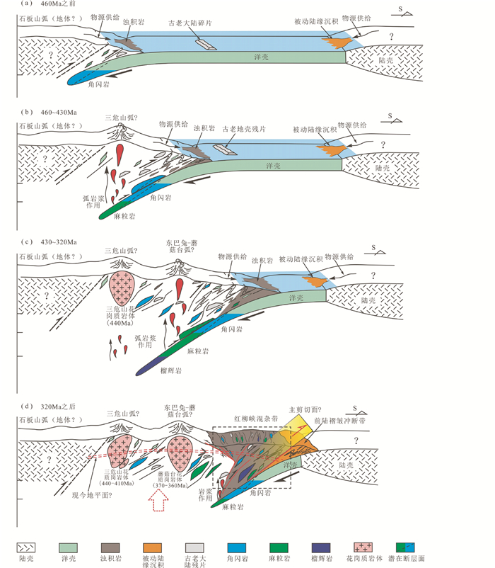 图 15 敦煌造山带构造演化过程示意图 (a) 460Ma之前,大洋板片向北俯冲消减于石板山弧(地体?)之下,古老地壳碎片也向俯冲带运移;(b) 460~430Ma,高级变质基性岩块的折返和在俯冲带的构造堆叠,并伴随着花岗质弧岩浆作用;(c) 430~320Ma期间,俯冲带向南后撤,高级变质基性岩块继续折返,花岗质岩浆弧南移;(d)碰撞作用可能发生于320Ma之后 Fig. 15 Tectonic evolution history of the Dunhaung Orogenic Belt (a) before 460Ma, the oceanic plate had subducted beneath the Shibanshan arc (terrane?), meanwhile, the ancient crust fragments in the ocean basin were transported to the subduction zone; (b) during 460~430Ma, the high grade metamafic rocks were exhumated and juxtaposed at the subduction zone, synchronously, granitic magmatism initiated in the obduction plate; (c) 430~320Ma, the high grade metamafic rocks continued to be exhumated and juxtaposed, accompanied by the subduction zone retreated southward. The younger episode granitic magmatism took place in somewhere southward; (d) the closure of oceanic basin postdate 320Ma |