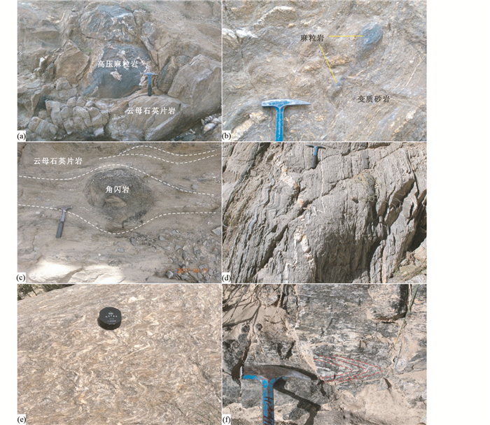 图 2 红柳峡混杂带野外露头特征 (a)云母石英片岩(变泥质岩基质)中的高压麻粒岩岩块;(b)变质砂岩基质中的麻粒岩岩块,岩块被拉长呈布丁状;(c)云母石英片岩中的角闪岩岩块;(d、e)强烈变形变质的基质中发育层间褶皱和柔流褶皱;(f)糜棱岩化基质,发育紧闭相似褶皱.图中虚线表示面理 Fig. 2 Field photographs of the Hongliuxia mélange (a) a HP granulite block within mica-quartz schist (a matrix of metapelitic gneiss); (b) a budding-like granulite block within a matrix of meta-sandstone; (c) a amphibolite block within mica-quartz schist; (d, e) intraformational and crumpled fold in the meta-sedimentary matrix; (f) mylonitized matrix and tight folds. The dotted line means the foliation |