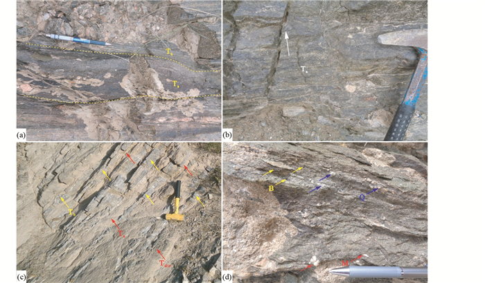 图 3 红柳峡混杂带弱变形浅变质基质的原生沉积构造特征 (a)鲍马序列Tab组合,由具高起伏底面的Ta段含砾砂岩和上部具平行层理的Tb段砂岩组成;(b)具正粒序结构的Ta段粗砂岩,底面发育泥质Rip-up;(c)鲍马序列Tbde组合,由Tb段薄层状砂岩和Tde段薄层状粉砂岩/泥岩构成;(d)块体搬运沉积(MTD)的砾岩,发育明显的下蚀面(主体为沉积再循环的杂砂岩,砾石成分包括B-变质基性岩砾石,Q-石英岩砾石,M-大理岩砾石) Fig. 3 Field photographs showing original sedimentary structures in slightly deformed and low-grade metamorphosed matrix slabs in the Hongliuxia mélange (a) Tab divisions of Bouma sequence composed of pebbly sandstone (Ta) with high reliefed base and parallel-bedding sandstone (Tb); (b) Ta division of Bouma sequence showing an upward coarsening (normal grading) sequence and pelitic rip-ups at the base; (c) Tbde divisions of Bouma sequence, composed of thin-stratified sandstone (Tb) and siltstone/mudstone (Tde); (d) conglomerate (mass-transport deposit, MTD) with significant incisional surface, mainly composed of recycled graywackes and minor metamafic gravel (B), quartzite gravel (Q), and marble gravel (M) |