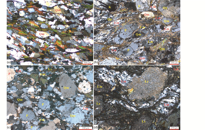 基质主要包括云母石英片岩和变质砂岩。云母石英片岩主要由云母、石英、斜长石及少量钾长石组成。云母呈鳞片状分布于石英或长石颗粒间隙,定向排列。石英呈他形粒状结构,具波状消光。斜长石他形-半自形粒状结构,定向不明显(图 4a)。变质砂岩主要矿物组合为石英、斜长石、云母和少量钾长石及岩屑。在片麻理较发育的变质砂岩中,石英被拉长呈条带状充填于其他矿物颗粒间,显示较好的定向性(图 4b)。在片麻理不发育的变质砂岩中,石英呈他形粒状结构,或多晶石英集合体,不显示定向性;斜长石为他形-半自形粒状结构,局部绢云母化;云母呈细小的鳞片状充填于长石和石英颗粒间隙;岩屑主要包括变质岩岩屑和(浅变质)沉积岩岩屑,见少量火山岩岩屑(图 4c, d)。样品中富含长石表明有火成岩物质再循环加入到基质中,这暗示基质的物源区可能有大量岩浆岩存在,且为近物源沉积。