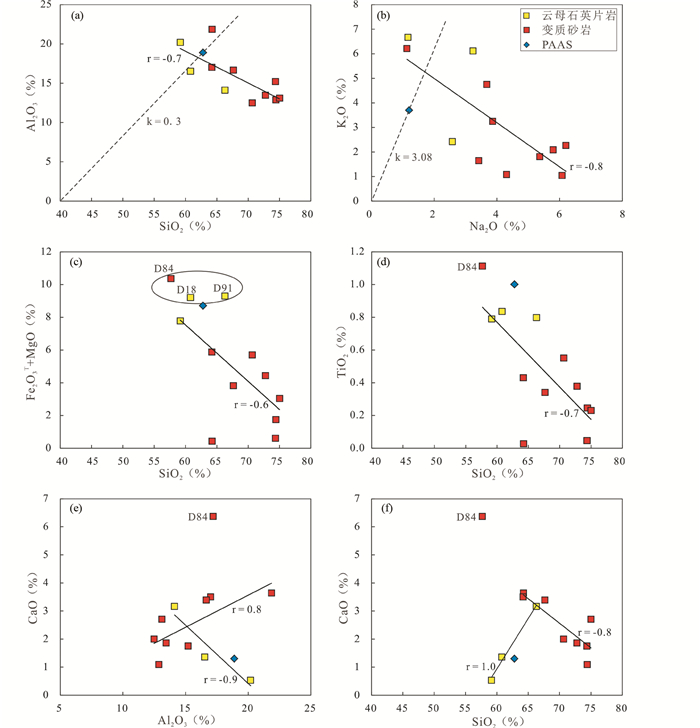 样品SiO2含量较高且变化范围较大(57.68%~74.43%,平均67.27%),Al2O3含量为12.49%~21.86%(平均15.89%),二者呈负相关关系(相关系数r=-0.7),Al2O3/SiO2比值平均为0.23,略低于PAAS的比值(0.30)(图 5a),反映了物源区母岩经历了较低程度的风化作用或母岩成分更偏酸性。K2O含量中等(1.04%~6.67%,平均3.28%),Na2O含量较高且变化范围较大(1.13%~6.20%,平均3.90%),明显高于PAAS中的含量(1.20%),且K2O/Na2O比值明显低于PAAS的比值(图 5b),可能暗示母岩富Na贫K或风化程度较低。Fe2O3T+MgO含量变化较大(0.43%~10.36%),与SiO2呈负相关关系(相关系数r=-0.8),大多数样品含量低于PAAS含量(图 5c),反映母岩成分相对贫乏铁镁质矿物。但个别样品(如D84)Fe2O3T+MgO含量高,可能因含有较多的黑云母和角闪石等暗色矿物。TiO2含量表现出与Fe2O3T+MgO相似的变化规律(图 5d)。CaO的含量普遍高于PAAS中的含量(1.30%),整体上低于4%(除D84为6.37%)(表 2)。