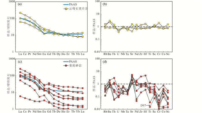 球粒陨石标准化稀土元素配分图中,片岩稀土元素组成相对均一,接近PAAS,而变质砂岩稀土元素组成变化范围较大(表 2;图 6a, c)。片岩稀土元素总量124×10-6~319×10-6,轻稀土元素相对富集,重稀土元素相对亏损((La/Yb)N=4.7~25.5),轻、重稀土元素比值6.2~16.7,稀土元素配分形式表现为右倾,显示弱的Eu负异常(Eu/Eu*=0.8~0.9)(图 6a)。变质砂岩稀土元素总量13×10-6~364×10-6,变化范围较大,轻稀土元素相对富集,重稀土元素相对亏损((La/Yb)N=3.8~67.6),轻、重稀土元素比值3.7~31.0,稀土元素配分形式表现为明显的右倾,Eu异常变化范围较大(Eu/Eu*=0.7~1.7)(图 6c)。