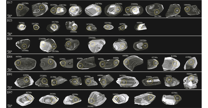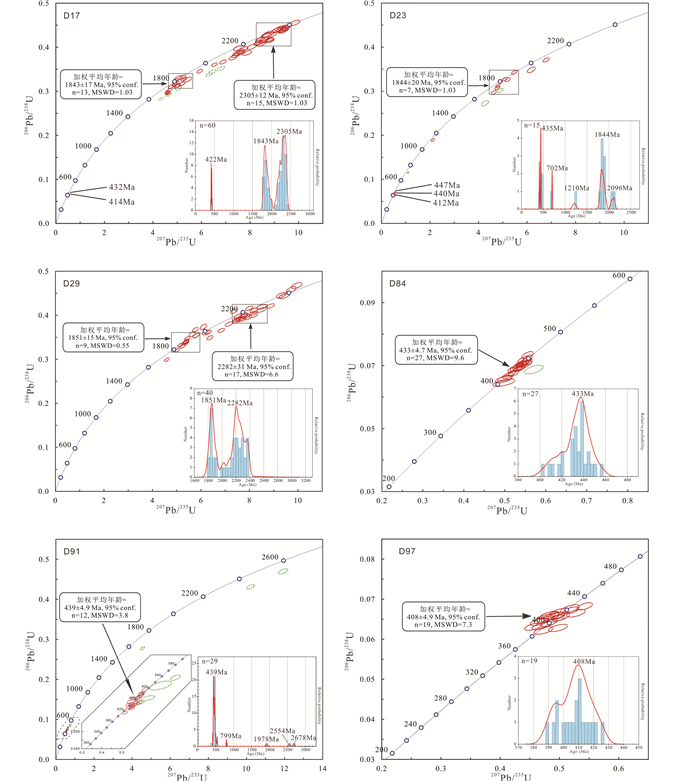 对D17中52颗锆石进行60个点测试,41点个来自具震荡环带的核部,14个点来自具无环带的边部,5个点来自具震荡环带的边部。大多数点的Th/U>0.1。获得54个谐和年龄,主要显示2组年龄:2400~2200Ma(加权平均年龄2305±12Ma)、1950~1750Ma(加权平均年龄1843±17Ma)(图 8-D17)。另有2个点获得414Ma和432Ma的古生代年龄,它们具有规则的震荡环带和柱状晶形,为岩浆锆石。