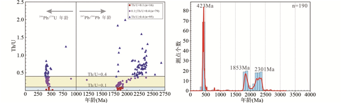 基质中碎屑锆石显示3组年龄:2400~2150Ma(加权平均年龄2301±17Ma,n=58),锆石Th/U>0.1,可能为岩浆锆石;1950~1790Ma(加权平均年龄1853±12Ma,n=51),锆石大多数(32个)Th/U>0.1,可能为岩浆锆石,部分(19个)Th/U<0.1,可能为变质锆石;480~389Ma(加权平均年龄423±3.6Ma,n=74),锆石大多数(68个)Th/U>0.1,可能为岩浆锆石,少量(6个)Th/U<0.1,可能为变质锆石。另外,还有3个介于1250~750Ma和4个大于2400Ma的锆石年龄,最年轻岩浆碎屑锆石年龄为389Ma(图 9)。
