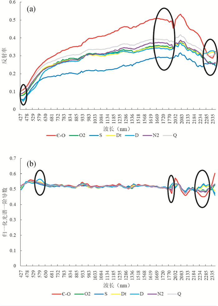 图 5 7个岩性类别的训练样本平均光谱曲线(a)和平均归一化光谱一阶导数曲线(b) Fig. 5 Average spectral curves (a) and average normalized spectral first derivatives curves (b) for training samples of seven classes |