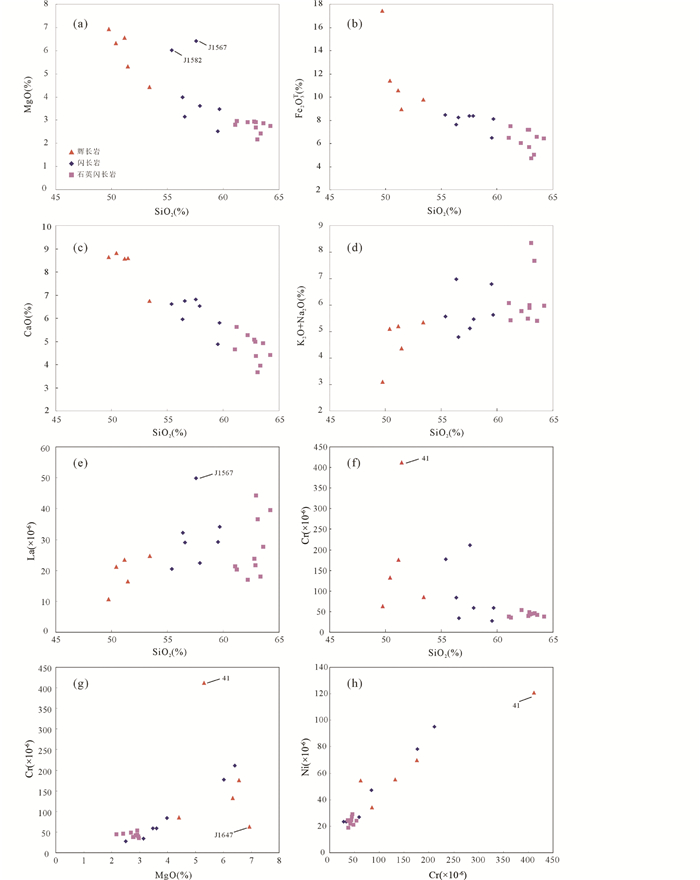 总体上,本次的闪长岩、石英闪长岩和辉长岩元素分析结果与Yang et al. (2008)的类似,但石英闪长岩的Th含量普遍偏高(图 8d)。辉长岩、闪长岩和石英闪长岩之间显示元素组成变化过渡(图 9)。SiO2与MgO、Fe2O3T、CaO之间具明显负相关关系,SiO2与K2O+Na2O之间具不明显的正相关关系。SiO2与La之间也存在不明显的正相关关系,而与Cr之间存在不明显的负相关关系。MgO与Cr之间及Cr与Ni之间存在正相关关系。