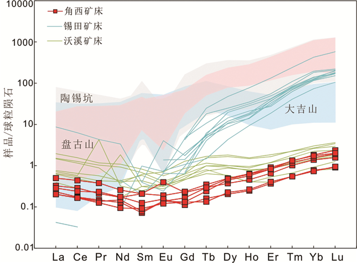 图 9 角西矿床稀土元素/球粒陨石配分模式图 其它矿床数据来源:黑欢,2012;于萍,2012;张思明,2012;祝亚男等,2014;Xiong et al., 2017 Fig. 9 Chondrite-standardized REE distribution patterns of wolframite from Jiaoxi deposit Data collected from: Hei, 2012; Yu, 2012; Zhang, 2012; Zhu et al., 2014; Xiong et al., 2017 |