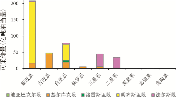 图 11 扎格罗斯盆地各段储层层系及其控制储量分布图 Fig. 11 Reservoir series and its controlling reserves in each section of Zagros basin |