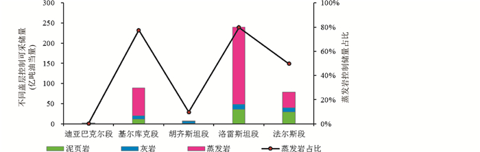 扎格罗斯盆地各段的油气储量规模与其盖层类型关系密切,与蒸发盐岩表现出正相关性(图 12)。从盆地各段的盖层类型来看,蒸发岩盖层对储量规模的贡献最大,控制储量占总储量的比例约为72%。其中基尔库克段渐新统-中新统蒸发盐岩和胡齐斯坦段中新统蒸发盐岩控制储量占比最高,为71%~80%;法尔斯段三叠系蒸发盐岩控制储量占比约50%(图 12)。