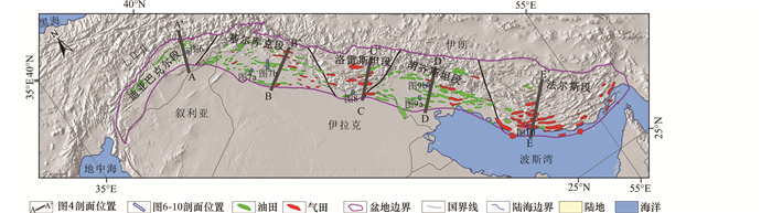 扎格罗斯盆地的区域构造、构造年代学、岩石学、油气田解剖等方面的研究均取得较丰富的成果(童晓光等,2004;白国平和郑磊,2007;贾小乐等,2013;何登发等,2015;刘小兵等,2018;Bordenave and Burwood, 1989;Sharland et al., 2001;Pitman et al., 2004;McQuarrie,2004;Sepehr and Cosgrove, 2004;Bosold et al., 2005;Ramsey et al., 2008;Bretis et al., 2011;Mansurbeg et al., 2016)。大多数研究者主要集中于盆地的局部地区或单个油气田的研究,Bahroudi and Talbot(2003)通过研究扎格罗斯盆地基底构造划分出不同构造单元,对扎格罗斯盆地各段构造及油气地质综合研究较少。因此,本文通过分析扎格罗斯盆地的区域构造地质、沿走向变化(盆地各段)的构造及其油气地质特征,进而总结油气主控因素,为中国石油海外超前选区选带提供基础。