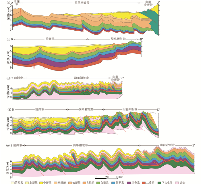 图 4 扎格罗斯褶皱带构造剖面图(据Konert et al., 2001; Jassim and Buday, 2006; Bosold et al., 2005) Fig. 4 The structural cross section of the along-strike Zagros basin (modified after Konert et al., 2001; Jassim and Buday, 2006; Bosold et al., 2005) |