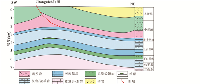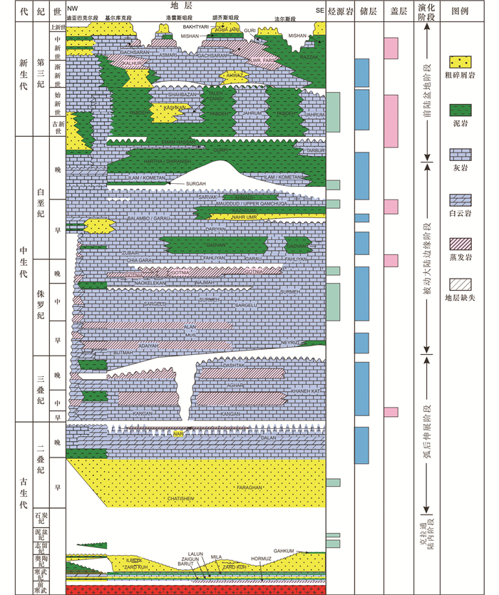 盆地沉积了元古界-新近系地层,最大厚度超过10000m,为形成丰富的油气资源奠定了雄厚的物质基础。盆地古生界埋藏较深,从二叠纪开始经历了稳定的沉降作用,三叠系至上新统-更新统基本上是一套连续的被动大陆边缘碳酸盐岩沉积地层(Alsharhan and Nairn, 2003)。盆地主要包括下白垩统、中侏罗统和志留系等烃源岩,其中,下白垩统Kazhdumi组烃源岩为中-新生界储层的主要油源,志留系Gahkum组泥页岩为古生界储层的主要气源;新生界碳酸盐岩为主力储层,其次是白垩系Sarvak组和上二叠统Dalan组碳酸盐岩;上二叠统-上三叠统、上侏罗统顶部和渐新统-中新统均不同程度的发育蒸发岩,为良好的区域性盖层(图 5)。