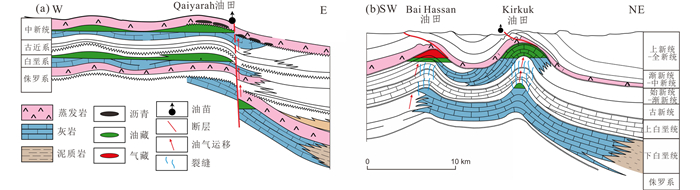 盆地储集层大多是碳酸盐岩储层,原生孔隙和渗透性较差,以新生界Asmari组灰岩为例,Asmari组灰岩孔隙度小于5%,渗透率小于3~4mD;但受中新世以来的扎格罗斯褶皱作用,在背斜部位形成了大量的裂缝,形成次生孔隙,大大改善了储层物性,其中孔隙度超过15%,最大可达22%,渗透率超过100mD,最大可达1000mD(Jassim and Buday, 2006)。同时,断层和裂缝在垂向上联通了不同层系的地层(Beydoun et al., 1992;刘小兵等,2018),使得白垩系Kazhdumi组烃源岩形成的油气发生垂向运移,聚集于基尔库克段和胡齐斯坦段的新生界背斜构造圈闭中,使其油气藏资源极为丰富(图 11)。