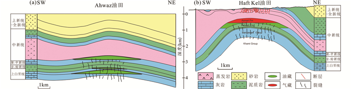 图 9 胡齐斯坦段Ahwaz(a)和Haft kel(b)油田剖面图 Fig. 9 Structural cross section of Ahwaz (a) and Haft kel (b) field in Khuzestan section |