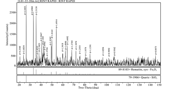图 8 老街子铅-银矿床中肉红色正长斑岩内铁氧化物X射线微区分析图谱(样品L03号) Fig. 8 XRD spectrum of iron oxide in syenite porphyry from the Laojiezi Pb-Ag deposit (Sample L03) |