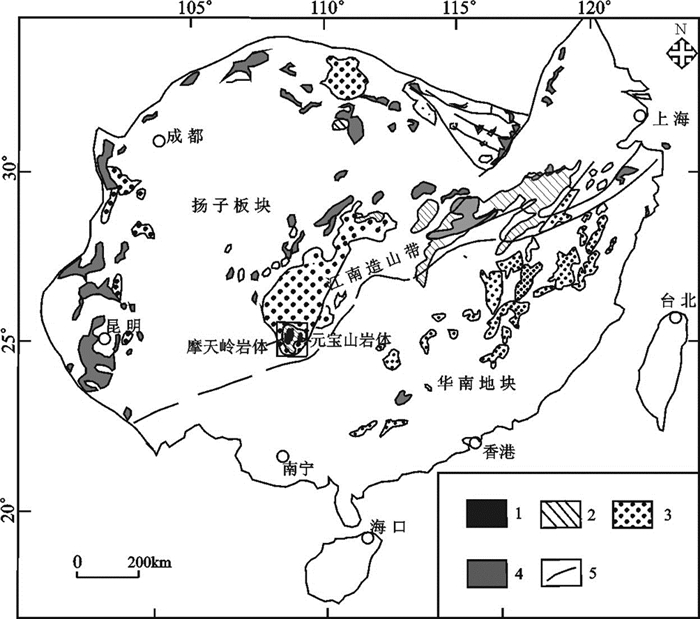 图 1 研究区大地构造位置示意图(据王剑, 2000; 宋昊等, 2015修改) 1-摩天岭岩体和元宝山岩体;2-中元古代地层;3-新元古代地层;4-岩浆岩;5-断裂 Fig. 1 Geotectonic location in the study area (modified after Wang, 2000; Song et al., 2015) 1-Motianling-Yuanbaoshan granite; 2-Pt2 strata; 3-Pt3 strata; 4-magmatic rocks; 5-fault |