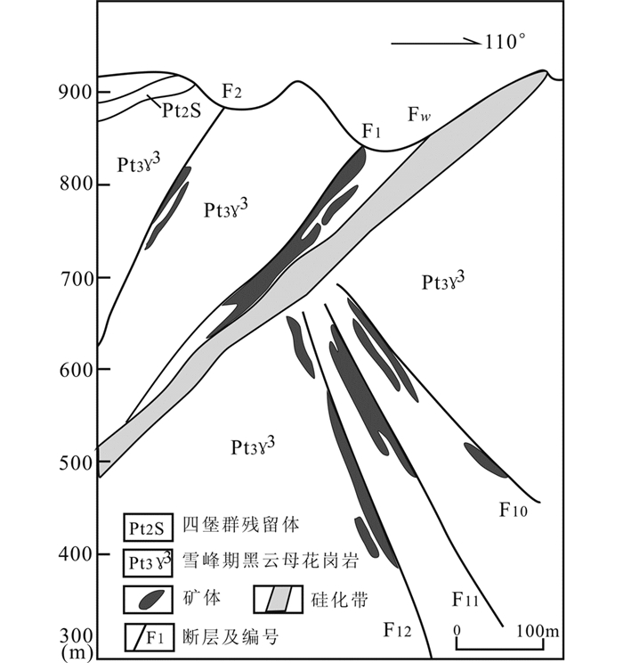 4.4.2 断裂控矿根据断裂与成矿的关系,将控矿断裂分为导矿构造和容矿构造。研究区的导矿构造是北东向的深大断裂,容矿构造可以是北东向的次级断裂,也可以是北西向的断裂。如新村矿床的主要矿体赋存于北东向的次级断裂带中,这些次级断裂带既有北西倾向,也有南东倾向(图 10)。达亮矿区的容矿构造则主要为走向北东、倾向南东的断裂,这种断裂带规模均不大,且大多与区域上的断裂产状不完全一致。