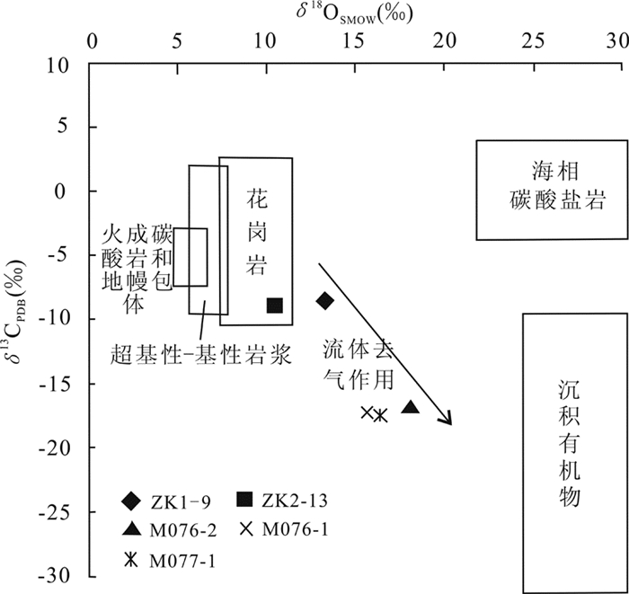 图 11 摩天岭地区铀矿床碳、氧同位素组成图(底图据刘建明和刘家军, 1997) Fig. 11 Carbon and oxygen isotope compositions of uranium deposits in Motianling granite (base map after Liu and Liu, 1997) |