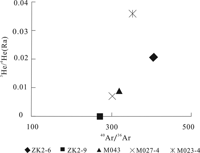 从表 9可以看出,3He/4He比值为0.001~0.046Ra,平均值为0.019Ra,40Ar/36Ar比值除其中1个样品未被检测出来外,其余样品为270.8~2300.9,平均值为658.4。除1个样品外,其余样品的40Ar/36Ar均明显高于大气Ar同位素组成(40Ar/36Ar=295.5)。
