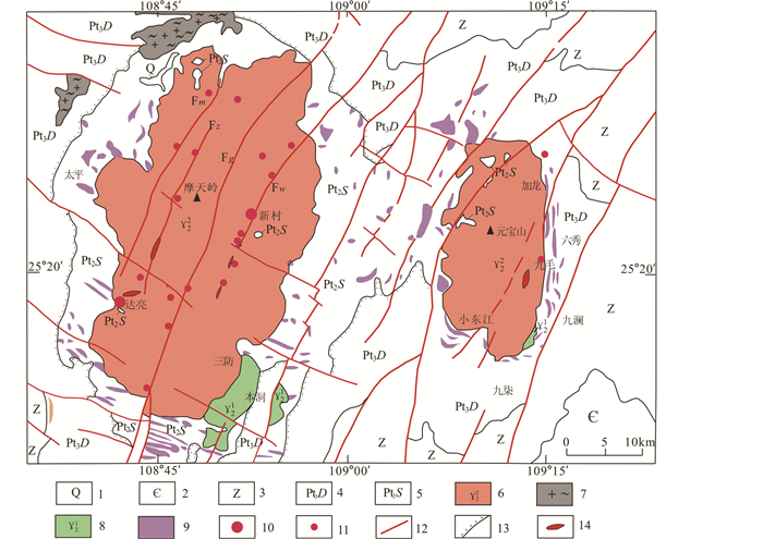 图 2 桂北摩天岭-元宝山地区地质简图(据徐争启等, 2014; 宋昊等, 2015修改) 1-第四系;2-寒武系;3-震旦系;4-丹洲群;5-四堡群;6-新元古代雪峰期花岗岩;7-新元古代雪峰期花岗混合岩;8-晚中元古代花岗闪长岩;9-中元古代基性-超基性岩;10-铀矿床;11-铀矿点;12-断层;13-地层不整合界线;14-中酸性岩脉 Fig. 2 Geological map of the Motianling-Yuanbaoshan area in northern Guangxi (modified after Xu et al., 2014; Song et al., 2015) 1-Quaternary; 2-Cambrian System; 3-Sinian System; 4-Danzhou Group; 5-Sibao Group; 6-Neoproterozoic granite; 7-Neoproterozoic granite migmatite; 8-Late Mesoproterozoic granodiorite; 9-Mesoproterozoic basic-ultrabasic rocks; 10-uranium deposits; 11-uranium ore spots; 12-faults; 13-unconformity boundary; 14-intermediate and acid dike |