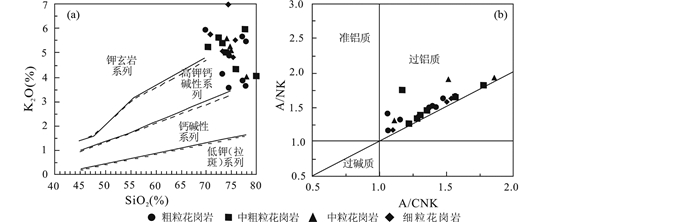 图 3 摩天岭岩体SiO2-K2O (a,实线据Peccerillo and Taylor, 1976; 虚线据Middlemost, 1985)和A/CNK-A/NK (b,据Maniar and Piccoli, 1989)图解 Fig. 3 SiO2 vs. K2O (a, solid line after Peccerillo and Taylor, 1976; dotted line after Middlemost, 1985) and A/CNK vs. A/NK (b, after Maniar and Piccoli, 1989) diagrams of Motianling granite |