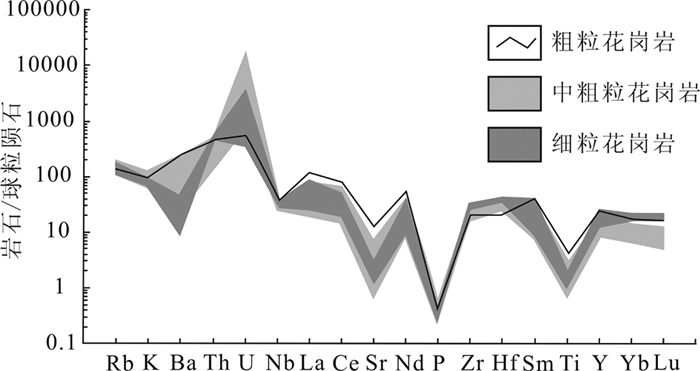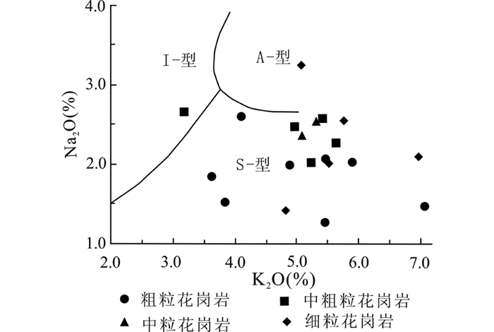 2.2 地球化学特征 2.2.1 样品采集及分析测试方法本文研究过程中采集摩天岭岩体不同粒度的新鲜花岗岩样品29件,其中粗粒花岗岩11件,中粗粒花岗岩9件,中粒花岗岩4件,细粒花岗岩5件。样品送往核工业北京地质研究院分析测试中心。