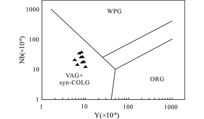 图 6 摩天岭岩体Y-Nb图解(底图据Pearce et al., 1984) WPG-板内花岗岩;VAG-火山弧花岗岩;Sysn-COLG-同碰撞花岗岩;ORG-大洋中脊斜长花岗岩 Fig. 6 Y vs. Nb chart of Motianling granite (base map after Pearce et al., 1984) WPG-intraplate granite; VAG-volcanic arc granite; Sysn-COLG-collisional granite; ORG-plagioclase granite of mid-ocean ridge |