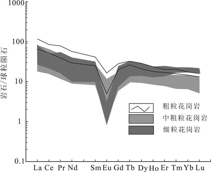 摩天岭岩体的球粒陨石标准化稀土元素配分模式见图 7。从表 2和图 7可以看出,摩天岭岩体不同粒度花岗岩稀土元素配分模式总体上具有相似的规律性,均富轻稀土,有较强的Eu负异常,Ce异常特征不明显。但不同粒度花岗岩稀土元素配分模式略有差异,细粒花岗岩Eu负异常更为明显且较为接近,轻重稀土分异较弱;中粗粒花岗岩Eu负异常较为分散,轻重稀土分异相对较大;粗粒花岗岩与中粗粒花岗岩稀土元素配分模式类似。反映了形成它们的花岗质熔体经历了高度的结晶分异作用。