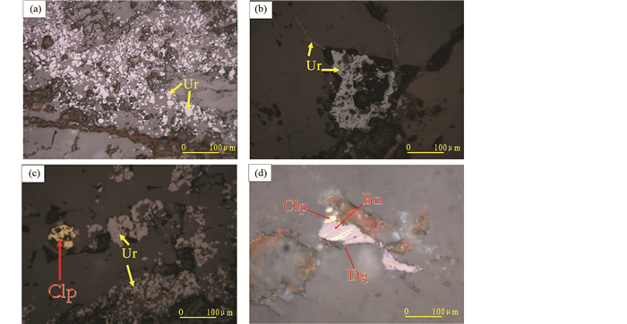 图 9 达亮矿床矿石镜下特征 (a)浸染状沥青铀矿(Ur);(b)团块状及脉状沥青铀矿;(c)沥青铀矿与黄铜矿(Clp)共生;(d)黄铜矿、斑铜矿(Bn)及蓝辉铜矿(Dg)共生 Fig. 9 Microscopic characteristics of pitchblende in Daliang deposit (a) disseminated pitchblende (Ur); (b) massive and vein pitchblende; (c) symbiosis of pitchblendeand chalcopyrite (Clp); (d) symbiosis of chalcopyrite, porphyry (Bn) and chalcopyrite (Dg) |