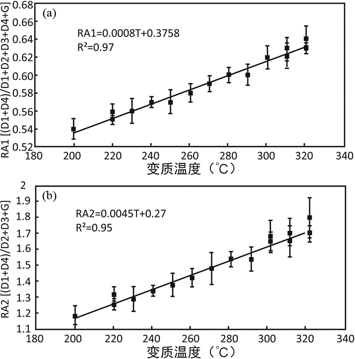Lahfid et al.(2010)对格拉鲁斯阿尔卑斯山低级变质岩(钙质片岩、石英片岩)的研究发现,低级变质岩中的碳质物拉曼光谱与高级变质岩中碳质物拉曼光谱明显不同且更加复杂,最显著的区别是高等级变质岩碳质物拉曼光谱中不存在D3、D4峰。低级变质岩中碳质物拉曼光谱的复杂性也暗示Beyssac et al.(2002a)基于中级变质程度提出的温度计不能简单的扩展至低温环境。进而,Lahfid et al.(2010)通过比较各种参数(如R1、R2)描述碳质物拉曼光谱随变质等级增加演变的能力,提出了两个新的参数RA1(RA1=(D1+D4)/(D1+D2+D3+D4+G)area)和RA2(RA2=(D1+D4)/(D1+D2+D3+D4+G)area),用于定量化描述格拉鲁斯阿尔卑斯山低级变质岩(钙质片岩、石英片岩)在200~320℃范围内的碳质物拉曼光谱随温度演化(图 5),通过简单变换可得到应用于200~320℃范围内的温度计方程式(公式3、4,表 1)。该温度计误差为±25℃,然而该温度计仅由一个变质区域的样品构建,正如Lahfid et al.(2010)所阐述的,用于校准该温度计的样品变质温度在一个有限的范围内,因此,无法将该温度计外延到温度高于320℃的变质环境。