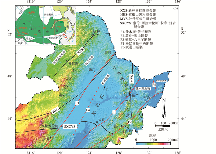 图 1 中亚造山带构造地质单元划分简图(a, 据Safonova and Santosh, 2014)和中国东北地质单元划分简图(b, 地质界线据Liu et al., 2017修改;高程数据引自Ryan et al., 2009) Fig. 1 Schematic tectonic map showing the main subdivisions of central and east Asian (a, modified after Safonova and Santosh, 2014) and tectonic divisions of the NE China, showing the major blocks, sutures and faults (b, modified after Liu et al., 2017; Ryan et al., 2009) |