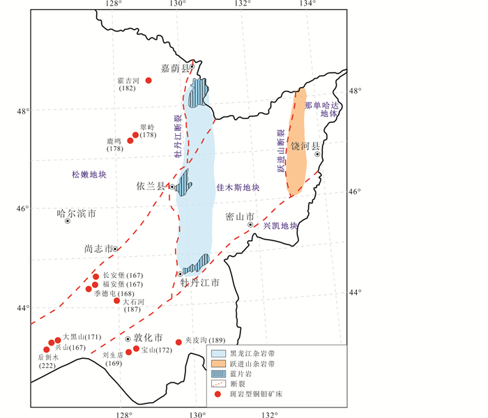 图 10 东北东部地区构造简图,示黑龙江杂岩和斑岩型铜钼矿床的分布(据Yang et al., 2017; Zhang et al., 2013; Zeng et al., 2018) Fig. 10 A simplified tectonic map of eastern NE China, showing the present day position of the Heilongjiang Complex and the distributions of the porphyry Cu-Mo deposits in the Lesser Xing'an-Zhangguangcai Range (modified after Yang et al., 2017; Zhang et al., 2013; Zeng et al., 2018) |