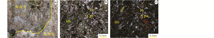 图 4 铁力地区辉绿岩野外和镜下显微照片 (a)辉绿岩与围岩花岗岩侵入接触关系;(b、c)辉绿岩主要组成矿物(b,单偏光;c,正交偏光).矿物缩写: Cpx-单斜辉石; Hb-角闪石; Pl-斜长石 Fig. 4 Field photograph and photomicrographs of the diabase from the Lesser Xing'an-Zhangguangcai Range showing field relationships and textures (a) showing the contact relation between the diabase and granite; (b, c) showing the main mineral assemblage of the diabase (b-plane polarized light; c-crossed polarized light). Abbreviation: Cpx-clinopyroxene; Hb-hornblende; Pl-plagioclase |