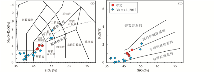 本文选取4个辉绿岩样品进行主量和微量元素测试,分析结果列于表 2。这组辉绿岩样品的SiO2含量为46.94%~49.94%,K2O含量为0.80%~1.42%,MgO含量为6.46%~9.86%,Mg#为56.7~70.1,Fe2O3T含量为9.47%~11.49%,TiO2含量为1.13%~2.13%,全碱(K2O+Na2O)含量为3.15%~4.11%。在TAS图解上(图 6a),样品都落入辉长岩区域。在K2O-SiO2图解上(图 6b),样品主要落入中钾-高钾钙碱性系列区域。