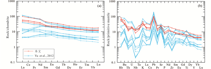 在球粒陨石标准化稀土元素配分图解上(图 7a),样品表现为轻稀土富集,重稀土亏损的右倾型曲线((La/Sm)N=2.08~2.26,(La/Yb)N=3.73~5.59,(Gd/Yb)N=1.51~1.96),Eu不具有正负异常特征(δEu=0.98~0.99)。在原始地幔标准化微量元素蛛网图上(图 7b),这组样品均表现出富集大离子亲石元素(如Rb、Ba、U、K和Sr等),亏损高场强元素(如Th、Nb和Ta等)和P元素的地球化学特征。