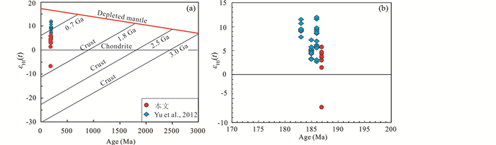 图 8 辉绿岩锆石Hf同位素特征(a、b) Fig. 8 Correlations between εHf(t) and ages of zircons from the diabase (a) with a zoomed in diagram shown in Fig. 8b |