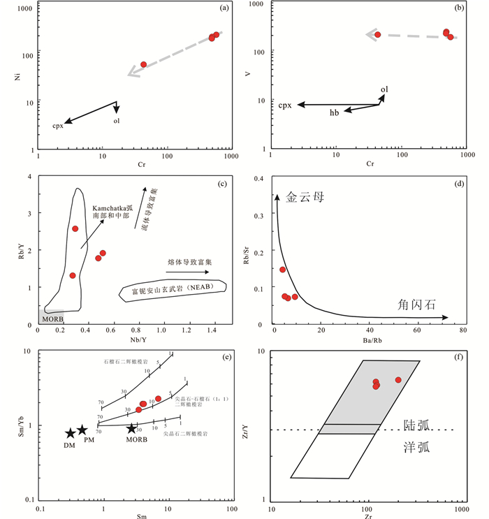 此外,近年来的研究表明,稀土元素含量和比值可以有效地限定幔源岩浆的起源及其熔融程度(Aldanmaz et al., 2000;Li and Chen, 2014)。其中,Sm为不相容元素,不容易受岩浆源区矿物相(如石榴石或尖晶石)含量变化的影响,而Yb在石榴石矿物相中为相容元素,在单斜辉石或尖晶石矿物相中为不相容元素。因此,Sm/Yb比值可以用来判别地幔源区矿物相(Aldanmaz et al., 2000)。当岩浆源区为尖晶石二辉橄榄岩部分熔融时,产生的熔体与地幔源区具有相似的Sm/Yb比值,构成近似水平的熔融演化趋势;当岩浆源区为石榴石二辉橄榄岩部分熔融时(石榴石残留),将会产生明显高于地幔源区的Sm/Yb值。本文辉绿岩样品的全碱(K2O+Na2O)含量、K2O含量以及K2O/Na2O比值相对较低,说明源区可能存在较少的含钾矿物相(如金云母、角闪石等)(Zhu et al., 2016)。此外,样品具有较低的Ba元素含量以及Ba/Rb比值(图 9d),进一步表明源区存在较少的角闪石矿物相(Furman and Graham, 1999)。在Sm/Yb-Sm图解中(图 9e),本文辉绿岩样品数值均接近或稍高于尖晶石-石榴石(1:1)二辉橄榄岩部分熔融线上,指示地幔源区为尖晶石-石榴石二辉橄榄岩,其部分熔融程度约为6%~20%。