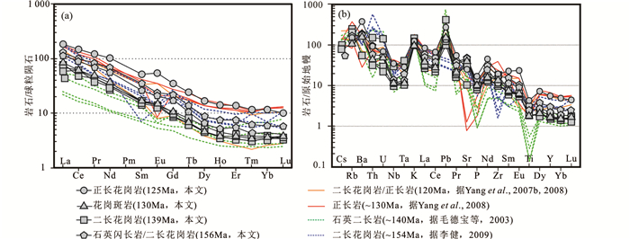 图 10 辽西兴城地区晚中生代花岗质岩石球粒陨石标准化稀土元素配分图(a, 标准化值据Boynton, 1984)和原始地幔标准化微量元素蛛网图(b, 标准化值据Sun and Mcdonough, 1989) Fig. 10 Chondrite-normalized REE patterns (a, normalization values after Boynton, 1984) and primitive mantle-normalized trace elements spider diagram (b, normalization values after Sun and McDonough, 1989) of the Late-Mesozoic granitoids in Xingcheng area, western Liaoning Province |