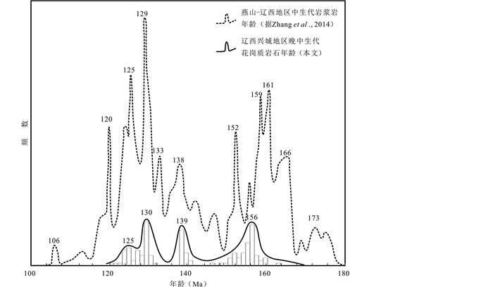 图 11 燕山褶皱带(据Zhang et al., 2014)和辽西兴城地区中生代岩浆岩年龄直方图 Fig. 11 Histogram of ages of magmatic rocks from Yanshan fold belt (modified after Zhang et al., 2014) including Xingcheng area, western Liaoning Province |