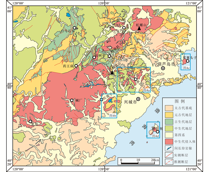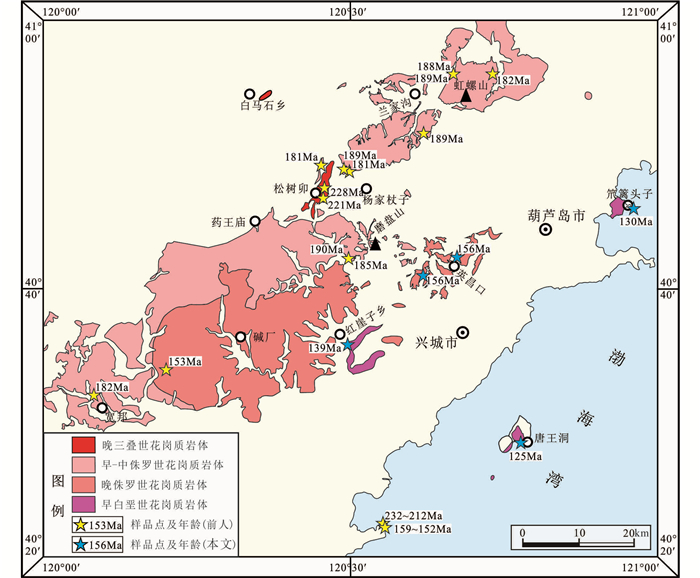本文研究区——辽西兴城地区位于华北克拉通北缘东段燕山褶皱带东南部,中生代期间区内印支期-燕山期构造岩浆活动强烈,在早期形成的EW向构造格架基础上叠加了晚中生代NE向和NNE向褶皱和断裂构造,并出现一系列陆相火山沉积岩系发育的中小型断陷盆地(图 2),形成了广泛分布三叠系红垃子组、侏罗系海房沟组、髫髻山组、土城子组、白垩系义县组等中生界火山-碎屑沉积地层。研究区内出露的大面积中生代侵入岩以花岗质岩石为主,现有同位素测年数据显示其大多形成于侏罗纪、少量形成于晚三叠世和早白垩世(吴福元等, 2006; 代军治, 2008; 赵玉妹, 2012; 李健等, 2014; Liang et al., 2015),晚三叠世花岗质岩石仅出露于研究区中部的松树卯和西北部的白马石等地(图 3),出露面积很少;研究区内侏罗纪花岗质岩石大量出露且呈NE或NEE向展布,其中早-中侏罗世呈NE向分布于宽邦-药王庙-杨家杖子-兰家沟-虹螺山一带,而晚侏罗世花岗质岩石则呈NEE向分布于研究区略偏东部的碱厂、英昌口等地(图 3);早白垩世花岗质岩石零星分布于研究区东偏南部的红崖子、唐王洞、笊篱头子等地(图 3)。